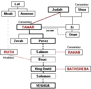 It is interesting to note that in the genealogy of Yeshua given in Matthew (1:1-16), only four women (besides Mary) are explicitly named: Tamar (who seduced the father of her late husband), Rahab (a prostitute), Ruth (a Moabitess), and "the wife of Uriah" (i.e., Bathsheba, an adulteress). Each of these women were justified by their faith in God's promises (Ruth 1:16; 4:12; 1 Kings 1:13-31; Heb. 11:31; James 2:25).